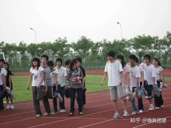以系別為單位,共七個(gè)隊(duì)伍。每隊(duì)十人,五男五女叉排成一橫排,相鄰的人把腿系在一起,一起跑向終點(diǎn),用時(shí)最短的勝出。分成三組進(jìn)行比賽,抽簽決定比賽次序。