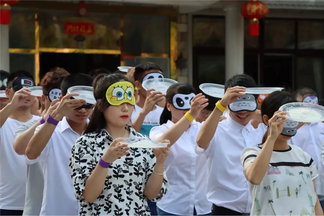 除了力量與才智,工作中更不可缺的是團(tuán)隊協(xié)作能力,接下來的這個游戲尤其考驗隊員的默契。每組隊員戴上眼罩向背后隊員傳遞面粉,藍(lán)隊通過完美的配合,以傳遞面粉量最多者獲得第一,積3分。