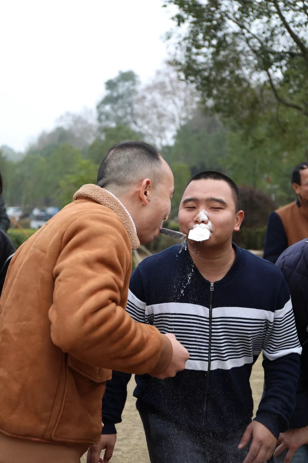 口令數(shù)字游戲是腦力和體力的較量,130余人隨著口令不斷分散、重組,場面緊張有序;面粉接力賽則更富趣味,只見選手們紛紛高抬著下巴,小心翼翼地將面粉傾入隊友的紙牌,面粉因忍俊不禁撲面而來,一輪過后,場上選手個個變身“白眉大俠”、“圣誕老爺爺”.......觀賽的小伙伴們被逗得捧腹不止,笑聲一片。