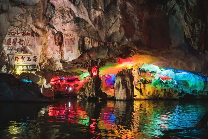 這里無峰不秀,有水皆青,湖中有山,山中有洞,洞中有河,處處是景,景景皆奇。石灰?guī)r巖峰如北斗七星一樣巧布在湖面上,山中古廟、溶洞景觀,處處皆景,奇幻多姿,令人目不暇給。
